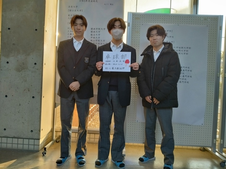 三味線部・スキー部・卓球部・生徒会の代表のみなさんであいさつ運動をしました。 三味線部:三味線を上手に弾くのを目標に日々練習しています。 受験生のみなさんへ 勉強頑張ってください!! 卓球部:近畿大会出場を目標としています。 受験生のみなさんへ 精一杯頑張りましょう!! スキー部:怪我をせずにスキーをすること、自然に感謝し、雪とケンカせずに活動しています。 受験生のみなさんへ 自己実現に向けて最高の準備をしてください。スキー活動で元気になりましょう!! 今日も元気に「おはようございます!!」